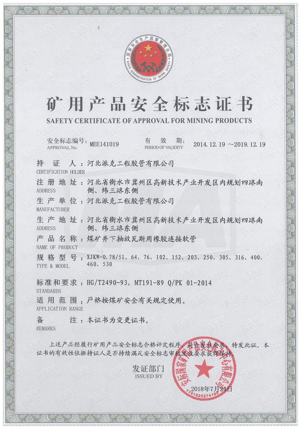 煤礦井下抽放瓦斯用橡膠連接軟管證書